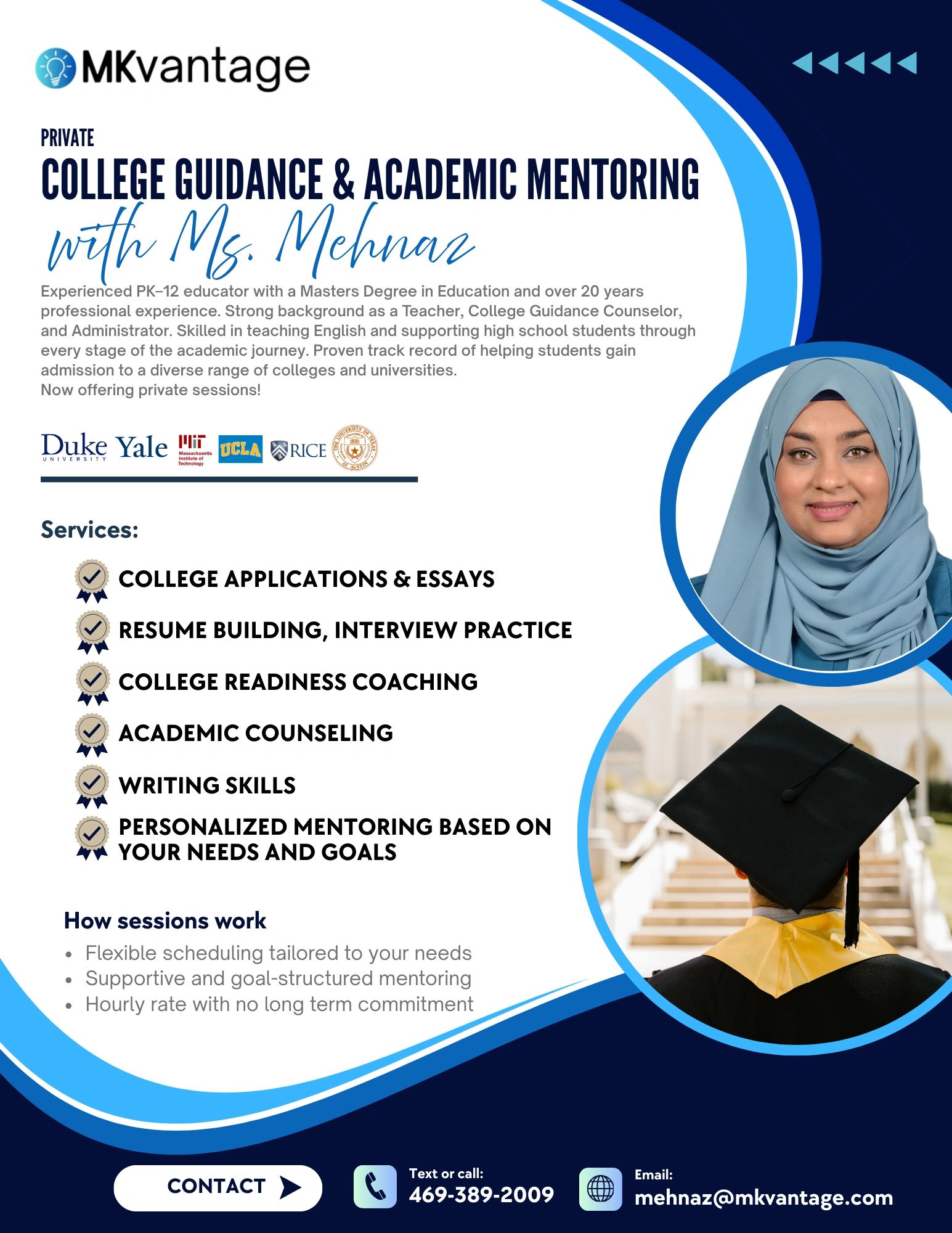 Guidance through every step of the college application process, from building a strong application profile to crafting authentic and compelling essays. I help students highlight their unique strengths, experiences, and aspirations while ensuring all application components are well-prepared and submitted on time.
